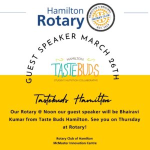 Rotary @ Noon welcome Bhairavi Kumar from Tatsebuds Hamilton. Tastebuds is a partnership of community agencies and community members that supports and facilitates local student nutrition programs for children and youth in Hamilton. The inclusive program engages students in enjoying healthy meals and snacks in a welcoming school setting. Tastebuds is committed to collaborating with […]